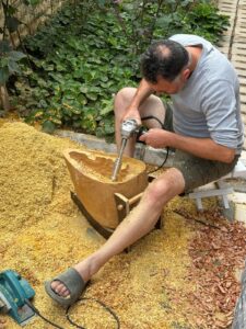 Once cut, the log is stored upside down for weeks so that water drains naturally. The bark stays on until the wood dries, protecting it from pests. After that, the craftsman seals the ends with glue to prevent splitting, and the wood rests in a cool, dark place for months.